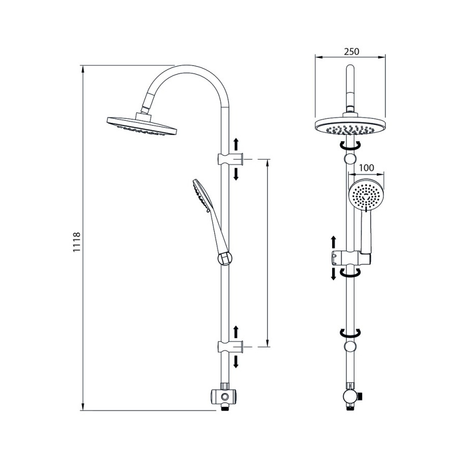 Senza miscelatore, Asta telescopica - Colonna doccia senza miscelatore con deviatore 2 uscite con presa acqua esterna in acciaio inox AISI 304, asta regolabile in altezza 78-115 cm., supporto doccetta scorrevole, doccetta tonda 1 getto diametro 10 cm. soffione tondo diametro 25 cm. con anticalcare, doppio flessibile inox.