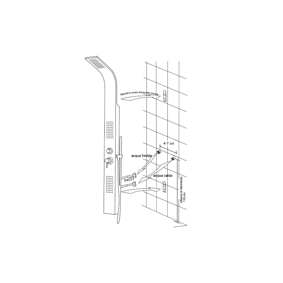 Miscelatore caldo freddo - Colonna doccia con miscelatore in acciaio inox AISI 304 finitura satinata. 3 funzioni selezionabili: doccetta minimale 1 getto, soffione doccia con anticalcare, getti orizzontali. Flessibile inox estensibile. Misure cm. 160x15x45
